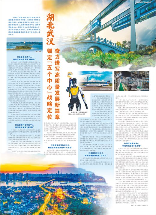 “十四五”期间,湖北省武汉市着力起草高质量发展的优秀答卷,以创新举措推动全面提升,加快国家中心城市建设,全力建设国家经济中心、国家科技创新中心、国家商贸物流中心、国际交往中心、区域金融中心。他奋力建设现代化武汉,在湖北加快建设中部地区崛起重大战略中心的过程中走在前列。